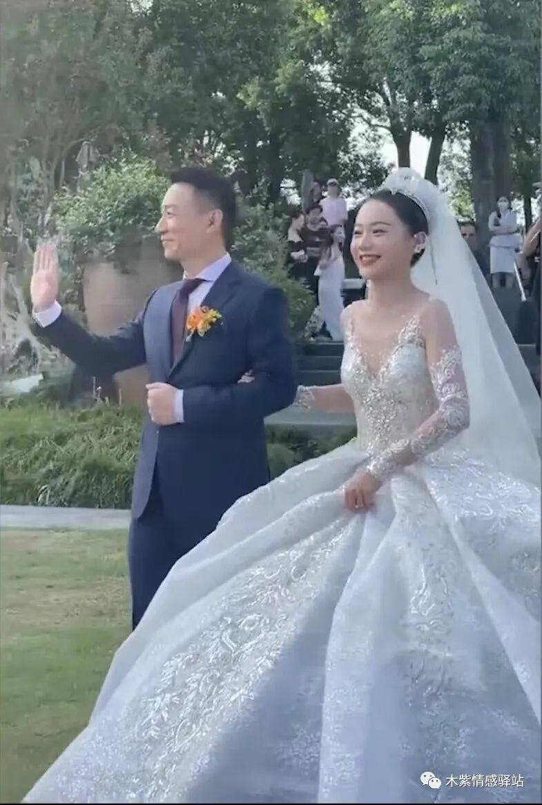 新娘挽着的男子也是面带笑容,只见他相貌英俊,仪表堂堂,身材挺拔,面如冠玉,真的是风度翩翩,给人一种玉树临风的感觉,男子一边慢慢走着,一边冲着周边的亲朋好友们挥手致意。