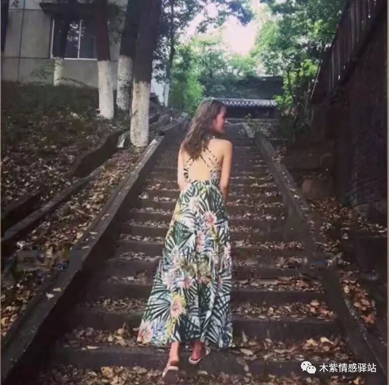 下一张画面,女子站在落满树叶的台阶前,身穿波西米亚民族风吊带长裙,裸露着光洁的后背,长长的卷发随意地披散着,周围幽暗而又颇有意境的古朴景色,和她高挑美丽的背影形成强烈的对比,相得益彰,让人不得不感叹,大自然造物主的神奇魔力。