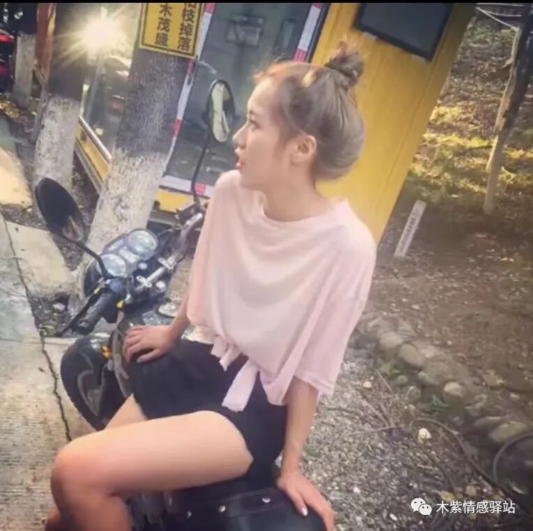 这是由多张画面组成的一段短视频,画面中,一名年轻女子身材窈窕,皮肤白皙,容貌秀丽,高高挽起的丸子头。她穿着粉色的真丝上衣,腰间打了一个蝴蝶结,下身搭配黑色修身短裙,露出一双修成的美腿,女子神色悠闲地坐在摩托车上,目视远方,神情惬意。