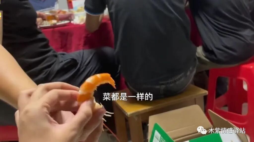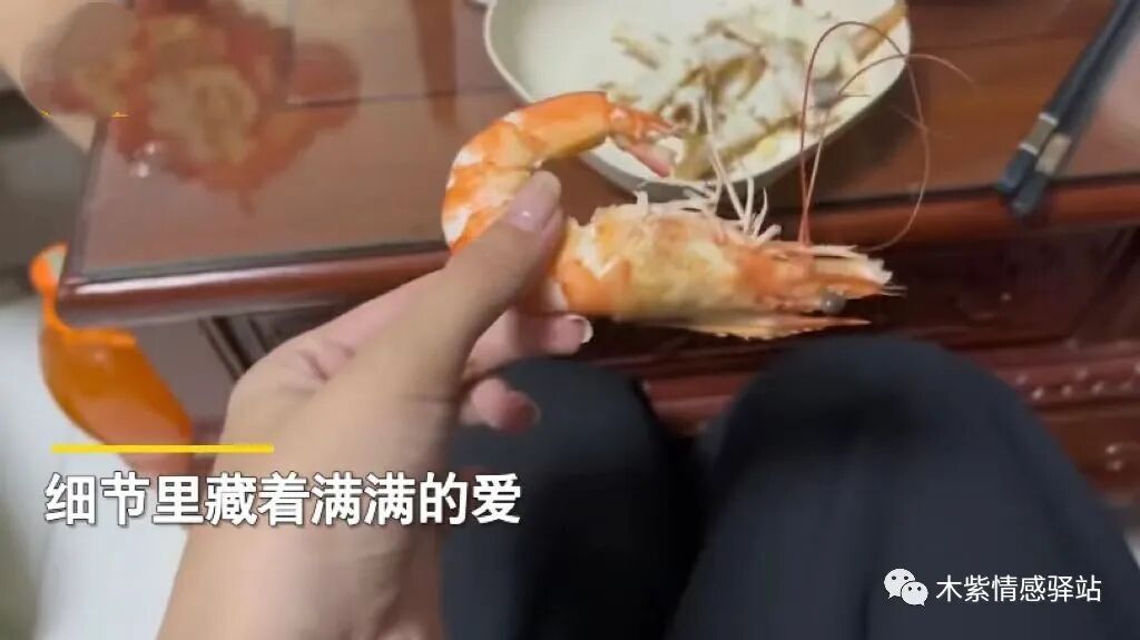 这时,男友悄悄地从他面前的大饭桌上面,递过来几只剥好的大虾,送给女友品尝。