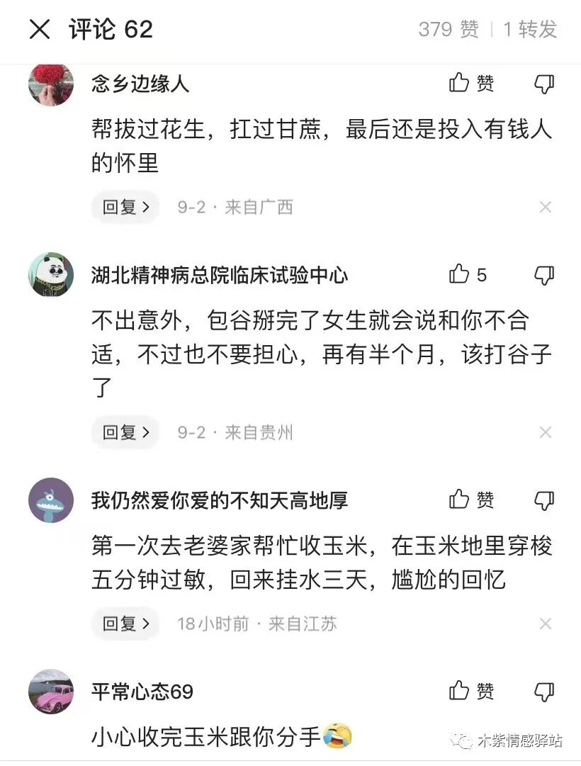 可是,也有男生的评论非常扎心,他说自己也是曾经跟着女友回家,帮忙拔过花生,扛过甘蔗,可是,女友最后还是投入了有钱人的怀抱。