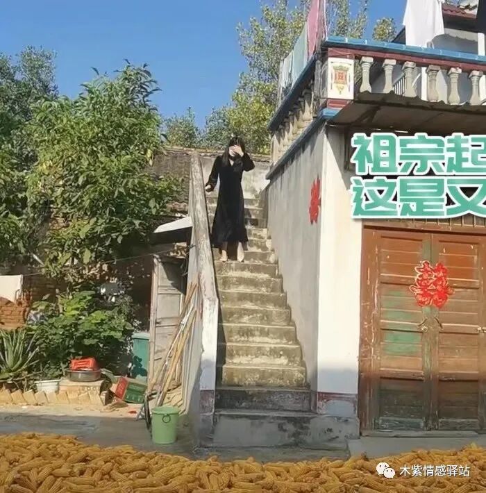 正值秋收农忙时节,一名男子手里拿着工具,正想要把家里的玉米摊开晾晒,这时,他新婚的妻子,穿着黑色的长袖修身连衣裙,白色中跟凉鞋,她化着精致的妆容,手里拿着精致的钱包,一只手扶着楼梯,另一只手遮挡住强烈的阳光,袅袅婷婷地从楼梯上走了下来。