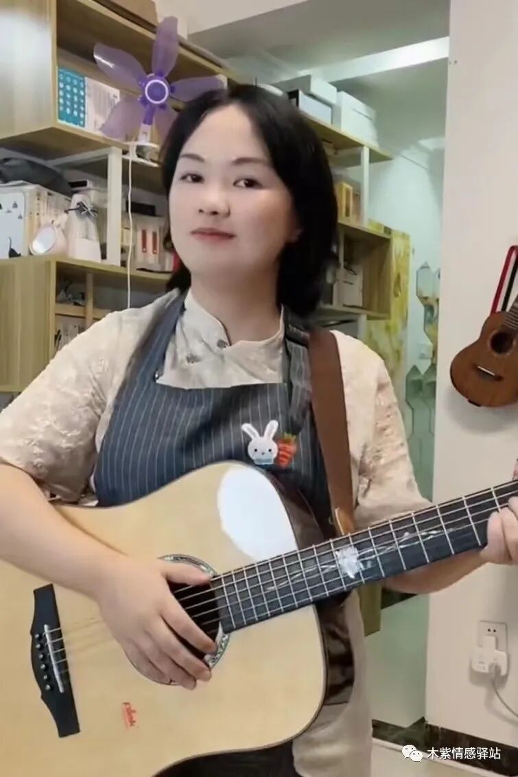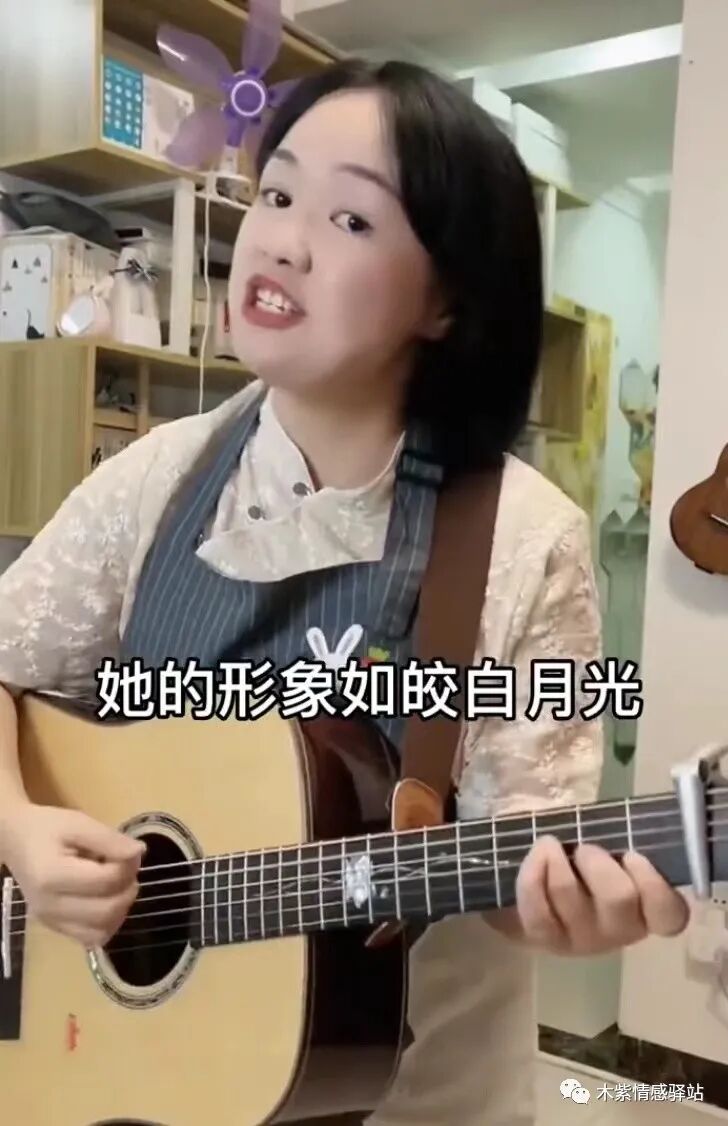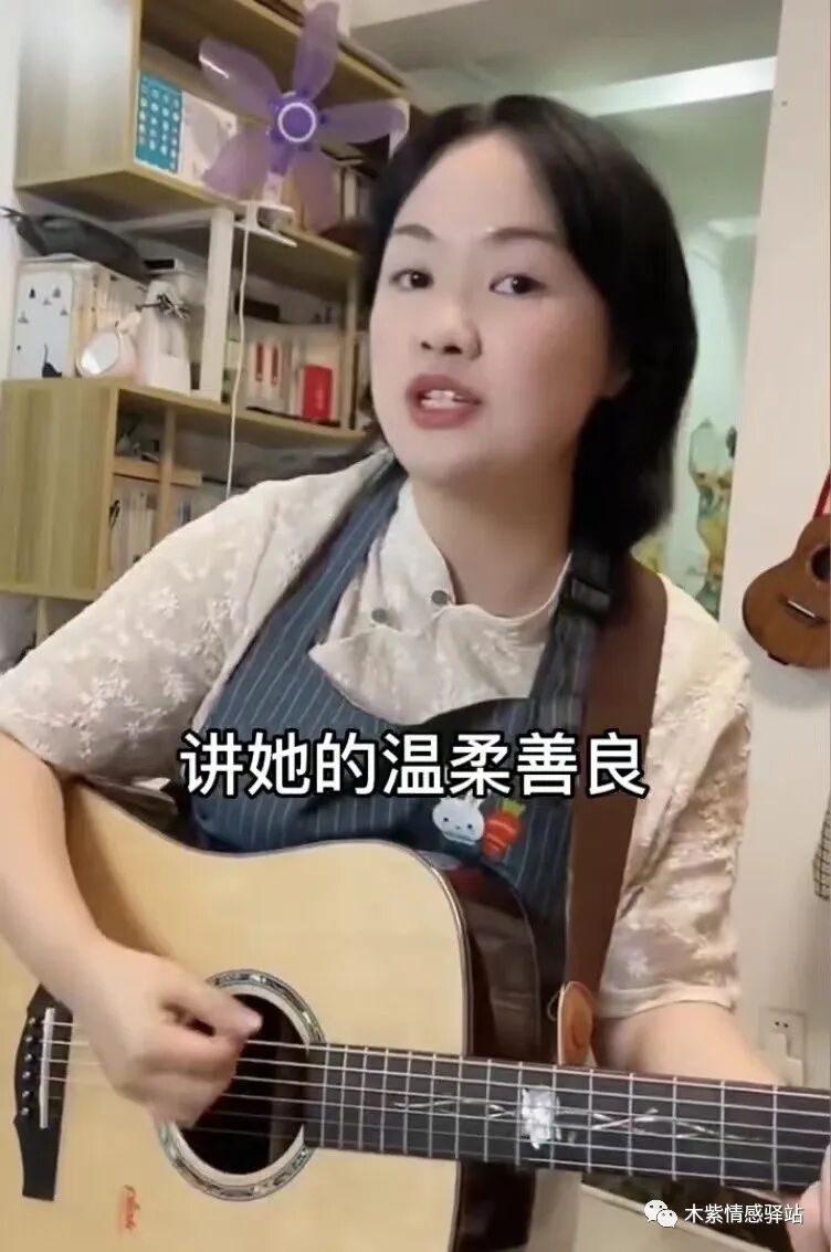这是水木年华的一首有名的歌曲,传唱久远,旁边的妻子听了后,扭转身,只见她胸前挂着一把大号的吉他,女子边弹吉他边大声唱起来:
