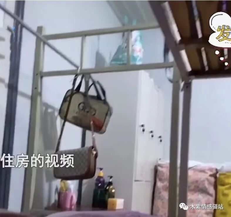 画面中,这是 一间不大的住房,刷着简单的白墙,角落里放置着一面简易木质衣橱,紧挨着是两大包鼓囊囊的衣物,靠墙立着一张铁制的上下铺,床的一头还挂着两个女生包包。