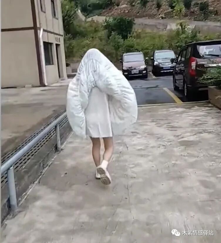 有趣的是,在回来的路上,天上突然下起了雨,婆媳二人都没有带伞,正当婆婆发愁之际,只见儿媳顺手撩起身上的裙子,把外层裙子从后面反折过去,顶在头上,就这样奇怪的样子,大摇大摆地回家去了。