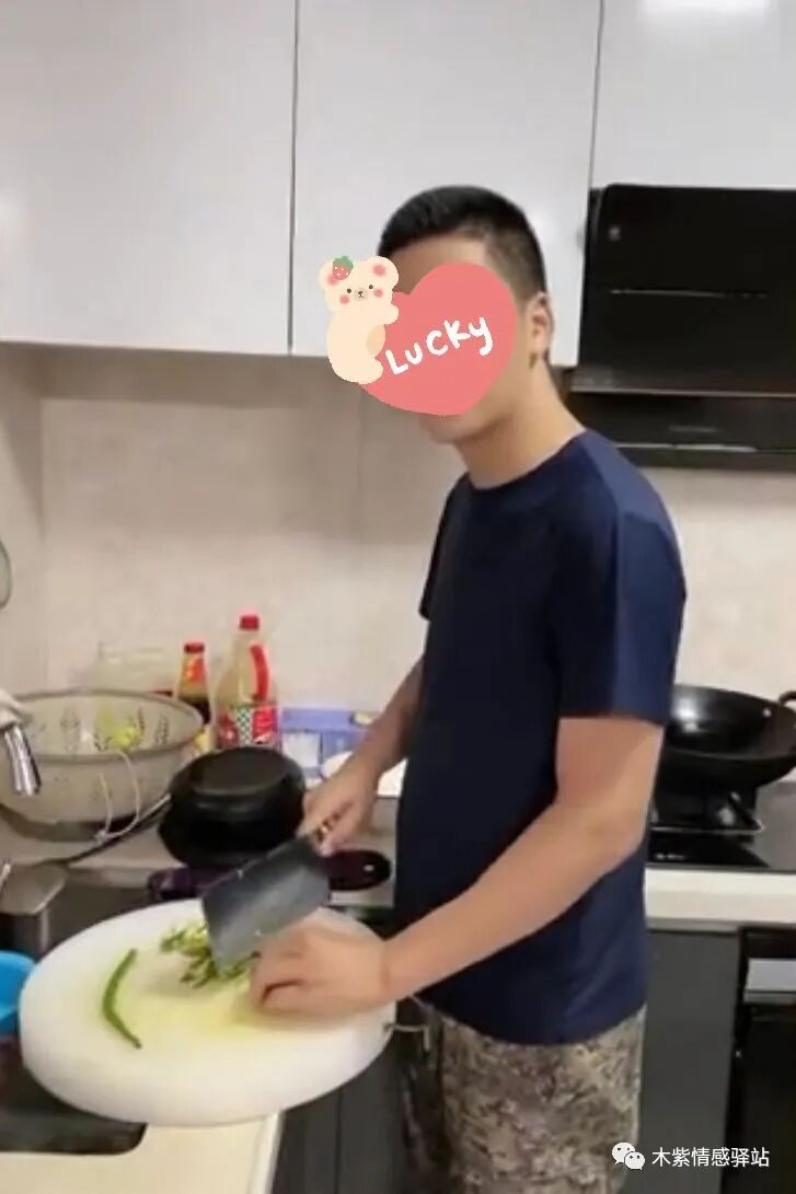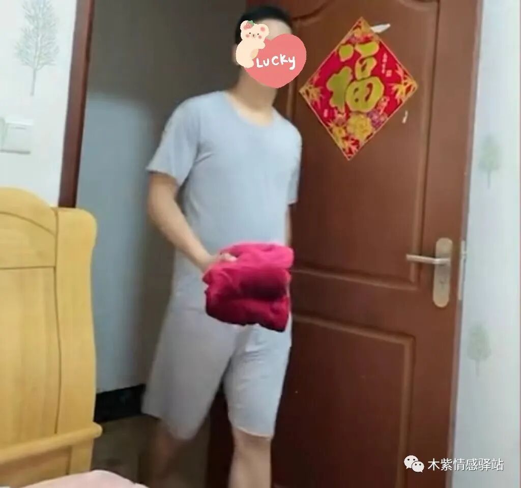 画面中,一位身材高大,面容英俊,还略带腼腆的年轻男子,穿着浅灰色短袖家居服,笑意吟吟地走进房间,他的手里拿着一件玫红色的女士睡衣,正是女子原来在家里穿的衣服。