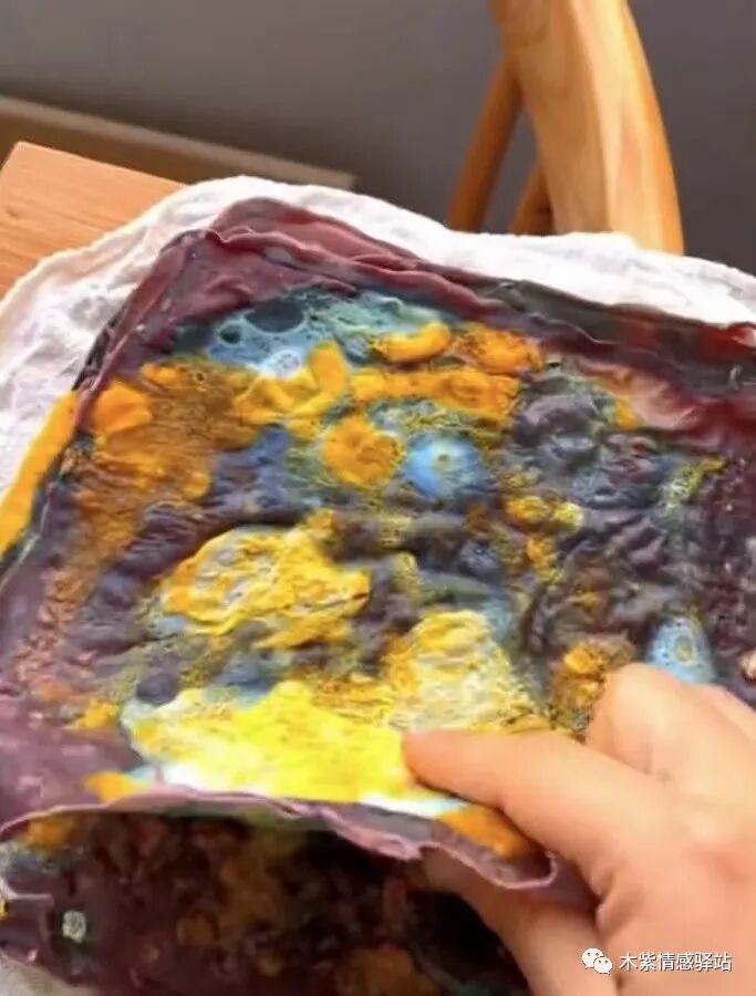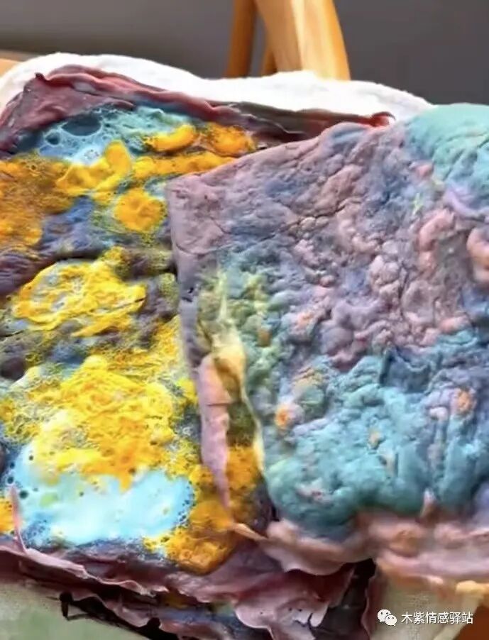 男子说,这是老婆跟着某网红学做的所谓“星空鸡蛋饼”,看起来确实颜色多样,丰富多彩,有紫色,蓝色,红色,桔色,还有乌黑的,甚至叫不上名来的颜色,只不过,这么多色彩组合在一起,给人一种诡异的感觉,就像是一块发霉了的抹布一般,实在是让人吃不下去。