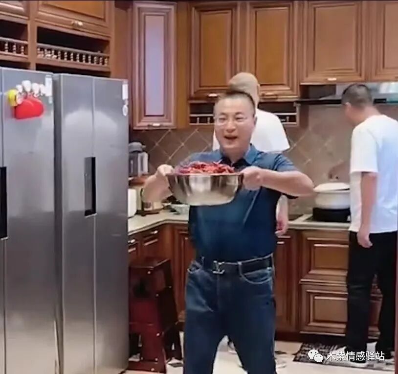厨房很大很宽敞,里面有两台立式冰箱,三个男人在厨房内做饭,干活,都没有丝毫拘束感,其中两名穿着白色短袖的男子,正在灶台旁忙碌着,而一个穿着牛仔裤,深蓝上衣的男子,则用双手端着一大盆麻辣小龙虾,满面笑容地走进客厅来。