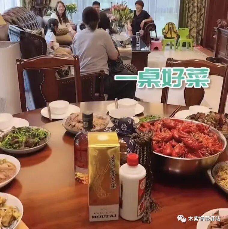 这边餐厅里,原木大桌上,摆满了各式菜肴,太丰盛了,让人垂涎欲滴,麻辣小龙虾,还有十几样其他小菜菜肴,再配上那浓香的茅台酒,这样的画面,让人忍不住流下口水。
