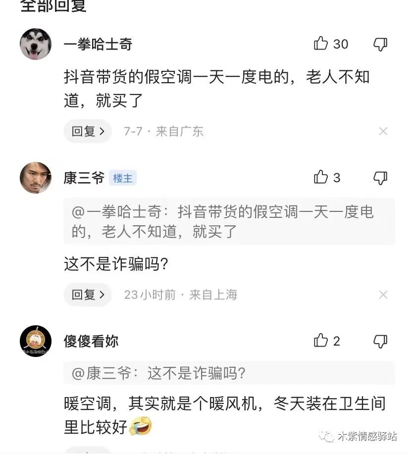 女子哭笑不得,告诉父亲他被骗了,上了商家的当,这不是空调,而是暖风机。父亲听了后有点儿恼火,但是他仍然坚持自己没有买错,不承认自己被骗,而且还十分生气,说就当自己打麻将输了两把而已。