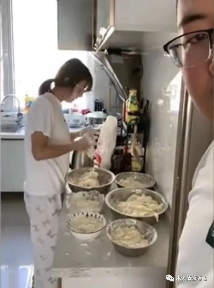 厨房不大,灶台上摆满了整整六个大小不一的面盆,妻子双手沾满面粉和面团,她的旁边,放着一袋面粉,已经快要用完了。
