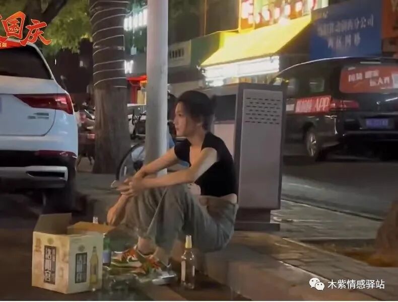 在她的脚边,还放着一个四方型的纸箱,里面已经空了,看来她一个人喝了不少的酒,她神色哀伤,落寞,看起来让人感觉很心疼,