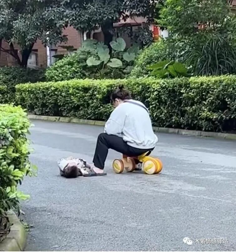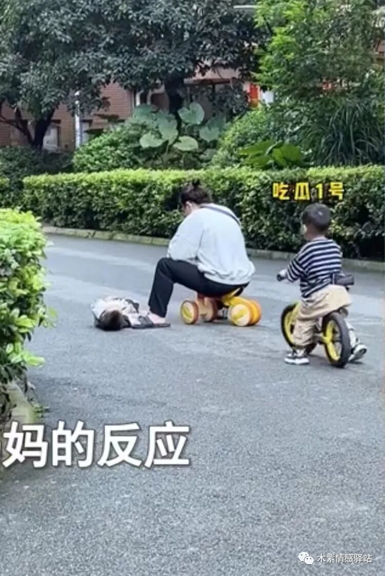 可是,宝妈丝毫没有反应,她就这么若无其事地坐在玩具车上,任凭孩子在地上哭闹不停,不哄,也不吵,看她的意思,等孩子哭闹够了,她自动会起身爬起来。