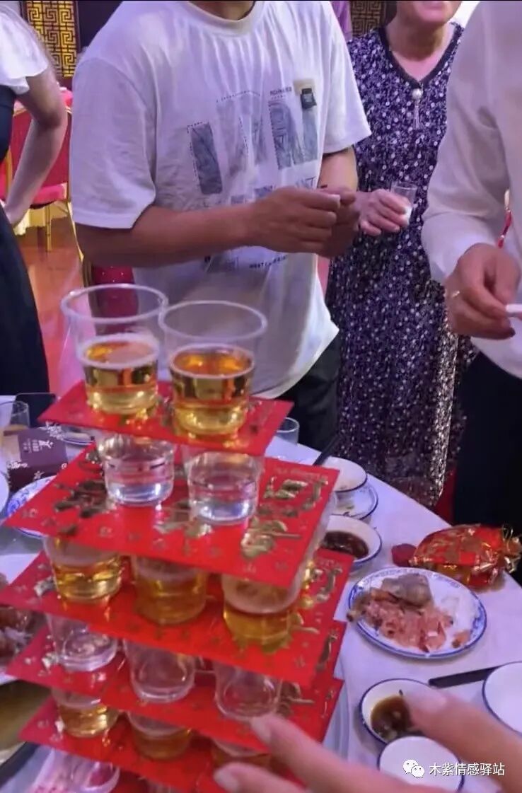 视频画面中显示,这是一处热闹的婚礼现场,众多亲友围在一起,中间是新娘和新郎,面前的桌子上,摆着一摞摞酒杯,一层白酒上面摆着一层红包,然后上面是啤酒杯子,里面都是满满的酒,就这么一层摞一层,足足有十几杯酒。