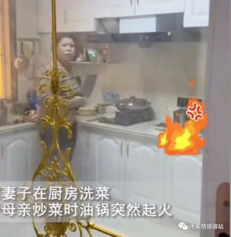 也许男子是担心厨房的火跑到客厅里,所以才会做出这样的举动吧,他这样的行为,彻底伤了老妈的心。