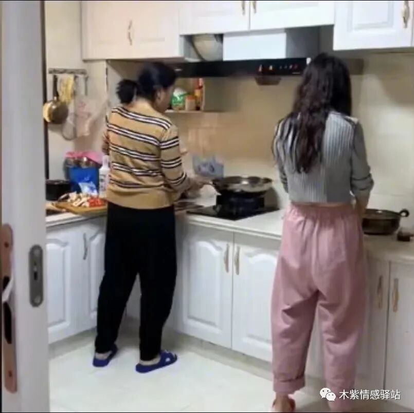婆婆扎着短马尾,干净利落,她正在炒菜;儿媳留着披肩发,在婆婆的旁边打下手。