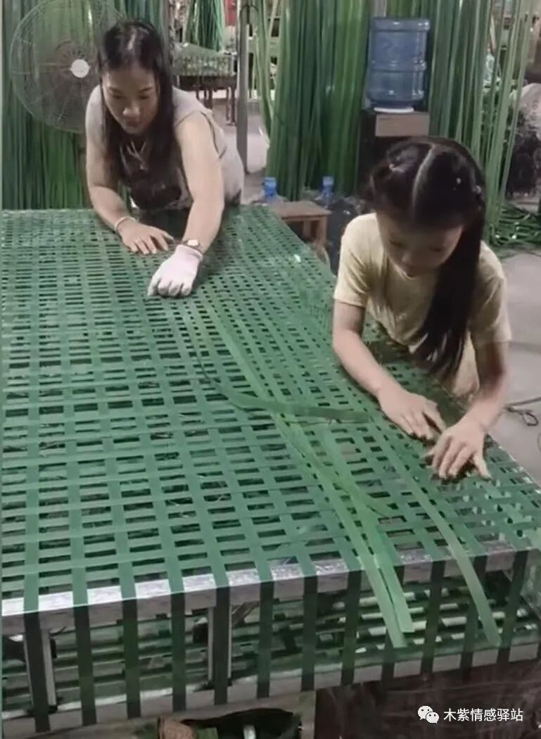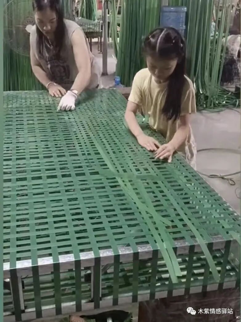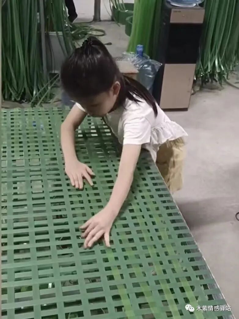 小女孩别看年纪不大,但是做起活来,异常灵活,只见她一双灵巧的小手,一只在前,引线,另一只手在后,推进,两只小手在床垫上快速推进,让人甚至看不出,到底是如何操作的,只听得“刺”的一声,一根绿色的藤条扯了出来,这一根就已经编完了。