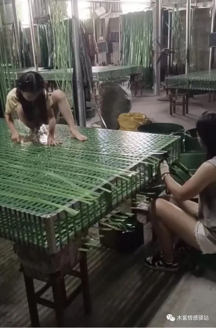 坐标广西南宁,这是一处简易的厂房,院子的一侧堆满了绿色的藤条,一位瘦弱的小女孩,看起来也就是8-9岁的年纪,她正站在一张宽大的床旁边,全神贯注地编织床垫。