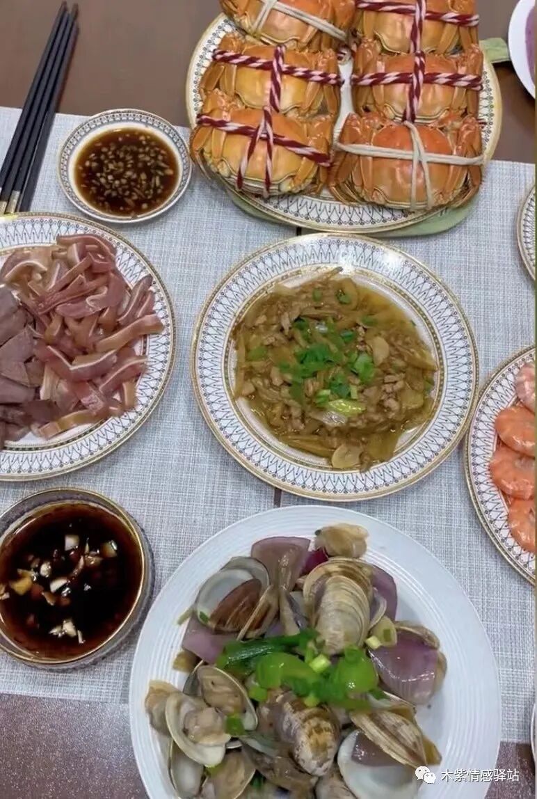 前夫是个厨艺很棒的男人,在厨房一阵忙活,很快就做出来一桌丰盛的菜肴,清蒸螃蟹,油焖大虾,葱爆蛤蜊,还有素菜肉沫茄子等。