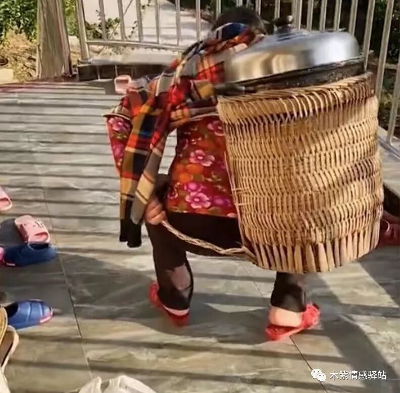老人走到二楼平台,她慢慢地蹲下身子,把背上的东西放到了地上,原来,竹筐内装着的是一口高压锅,里面是炖好的热腾腾,香喷喷的老鸡汤。