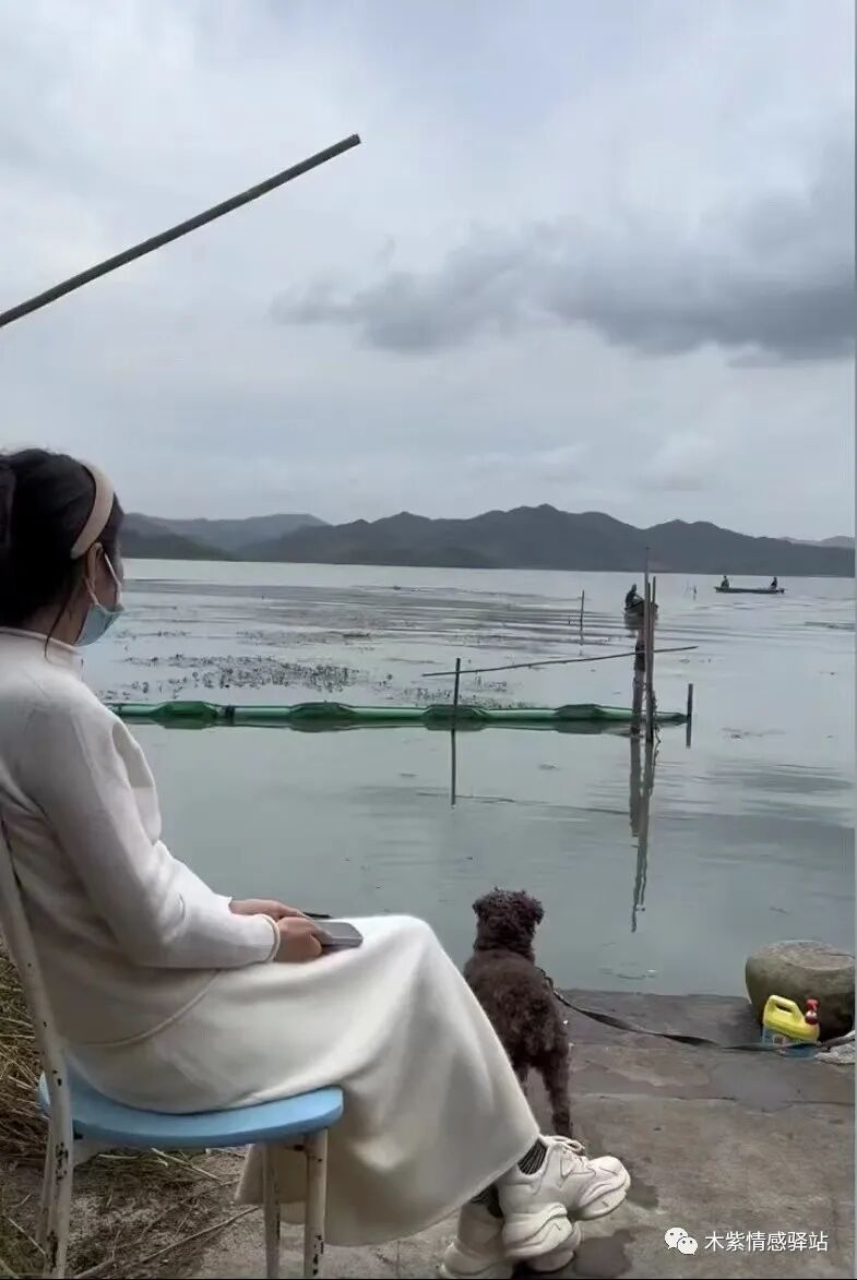 坐标浙江宁波,一名年轻女子,穿着白色连体长裙,戴着口罩,静静地坐在一片烟波浩渺的湖水边,她眺望着着远方,远处有几只小船正在湖面上划来划去。