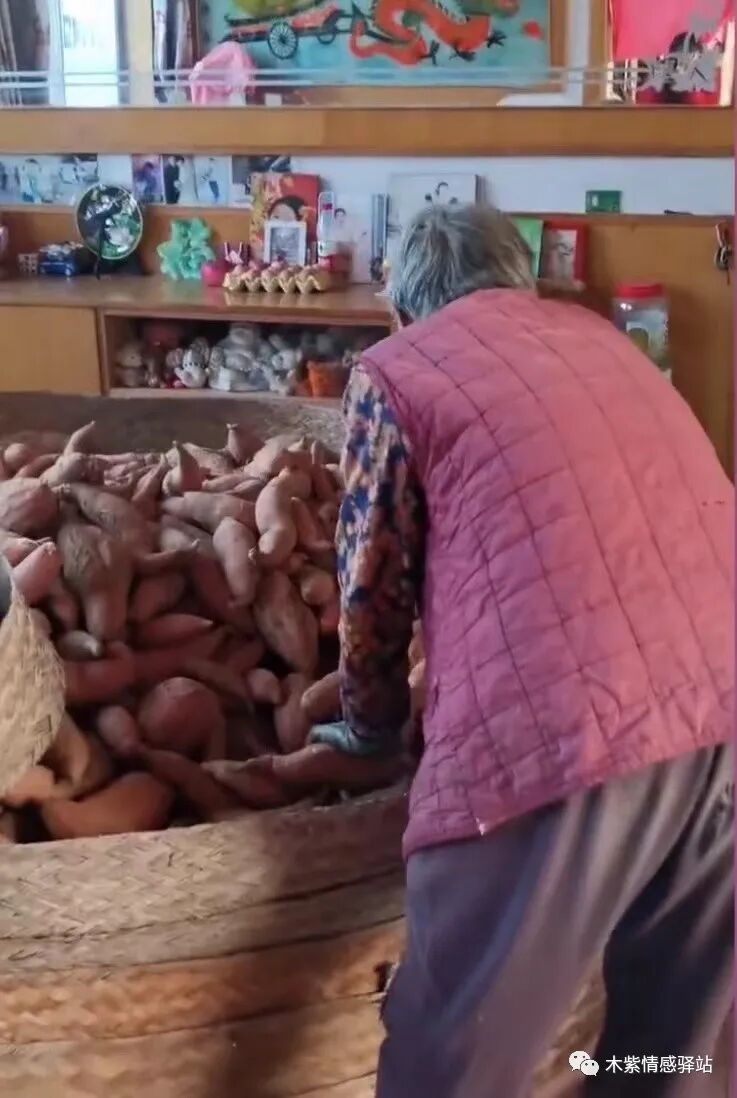 接下来就出现了眼前有趣的一幕,女子回家后,看到自家客厅里摆放了一个巨大的竹篓,里面堆满了新收的大地瓜,一位白发苍苍的老人,戴着手套,正围着大竹篓不停地忙活,她非常有耐心,把新鲜的地瓜,一个个摆放进硕大的竹篓里。