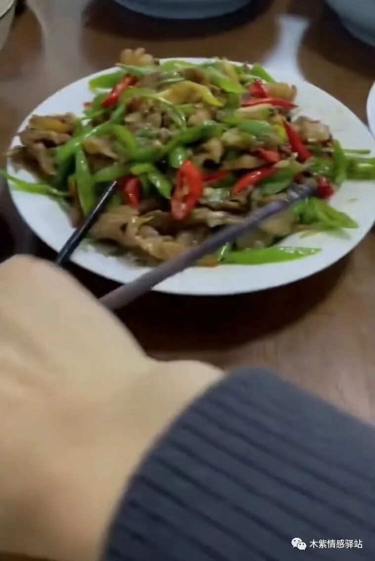 而在女子的对面,则是她的老公,男人亲自下厨做的饭菜,面前有青椒炒肉丝,还有其他小菜,荤素搭配,色香味俱全,香味扑鼻而来,让人垂涎欲滴。