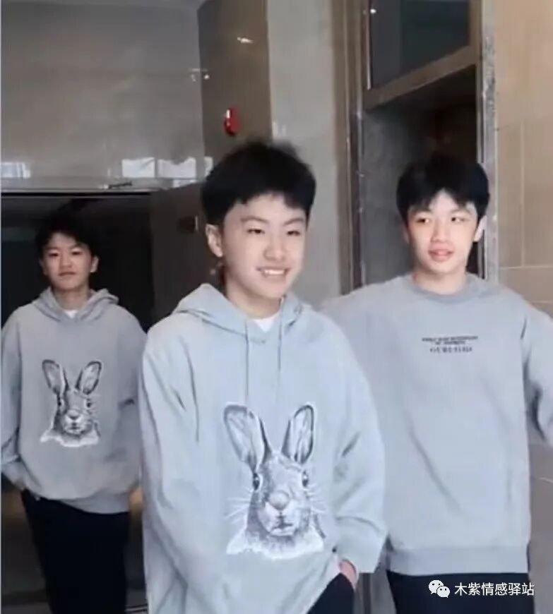 第一位出来的12岁双胞胎兄弟中的老大,小伙子穿着灰色连帽卫衣,上面印着长耳朵兔子的图案,下身搭配黑色裤子,他笑的阳光灿烂,迈着轻松的步伐,看到妈妈拿着手机拍照,忍不住害羞地抹了一下嘴巴。