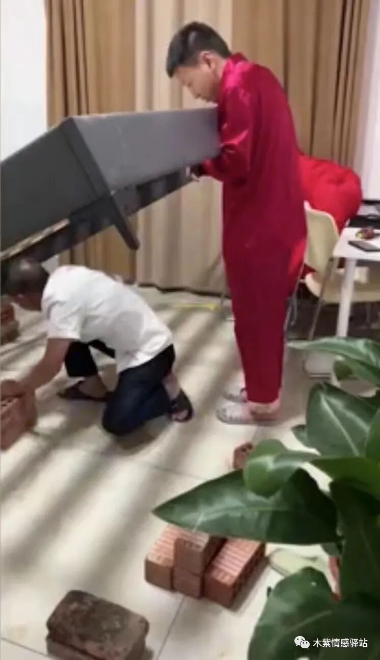 事后无奈,爸妈从外面小区里面找来几十块红砖,垫到了床底下,让小两口暂时委屈一下,将就睡一晚,等有时间了再想办法处理这张床。