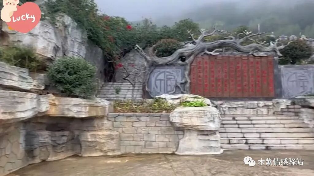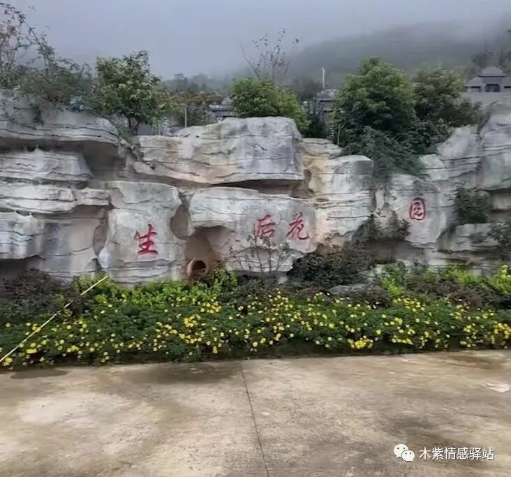 随着镜头的缓缓推进,一处错落有致的假山映入眼帘,上面写着几个红色的大字“人生后花园”,名副其实。