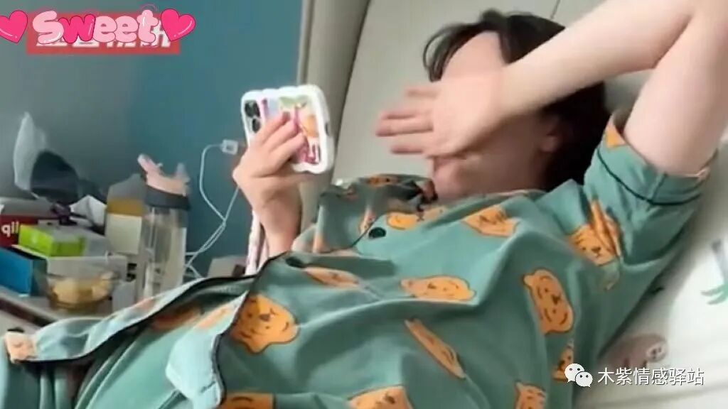 画面中,一名年轻女子,穿着印花短袖家居服,静静地躺在沙发上,她一只手枕在脑后,一只手拿着手机,好像在认真地看着什么。