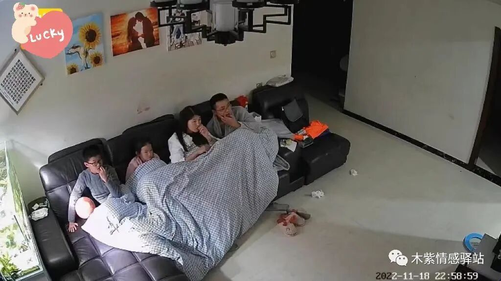看起来,屋内温度不高,因为一家人盖着一床棉被,他们悠闲地躺在沙发上,看得入迷。