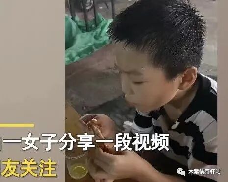 坐标河南平顶山,一名女子分享了一段视频,画面中,一个身材瘦削,面容清秀的小男孩,蹲在路边的小桌子旁边,津津有味地啃着手里的鸡腿。
