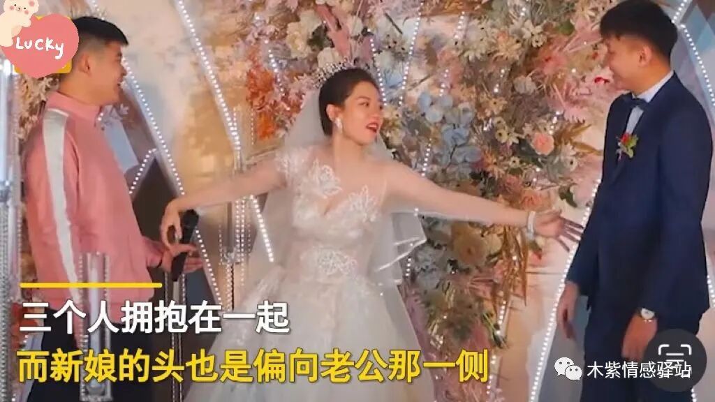新郎倒是有点窘迫起来,试图往后退,新娘赶紧伸手把老公拉了回来,然后三个人在一起,拥抱了一下。