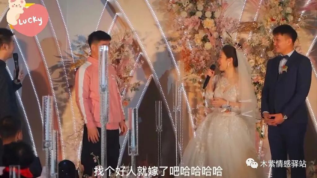 男生说这番话的时候,一直面带笑容,这时,主持人提醒新娘,说句对老同学祝福的话吧,新娘子接过话筒,调皮地大声说:你年纪也不小了,找个好人,就赶紧“嫁”了吧!