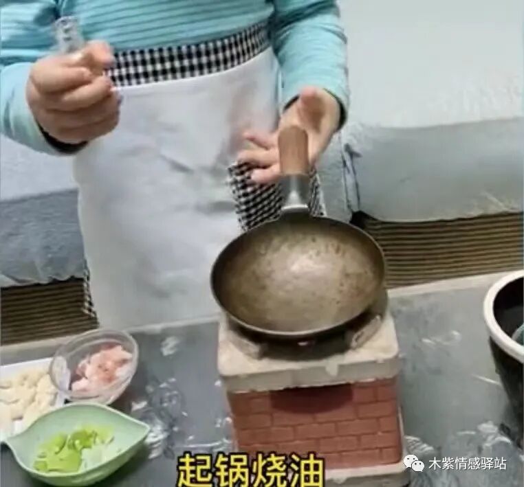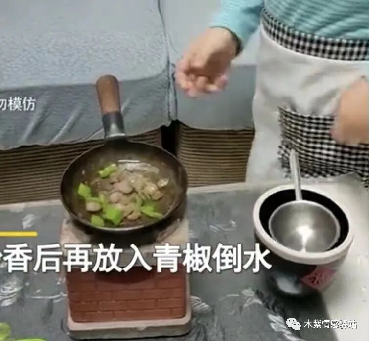 孩子面前是一个小小的灶台,里面燃烧着明火,前面还摆着各种调料,还有水缸,小勺子,小锅铲,这简直就是一个样样齐全的小型厨房,各种家什儿应有尽有。