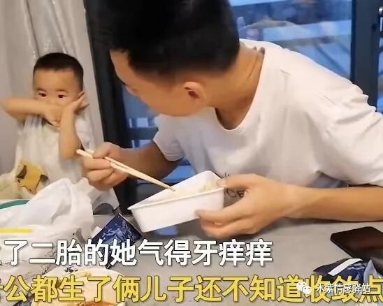 女子回家后,老公和两个宝宝正在等着她回家做饭,女子看到老公就气不打一处来,生气地把买来的盒饭扔给他们,并且训斥老公,都生了俩儿子了,还不知道收敛一点。