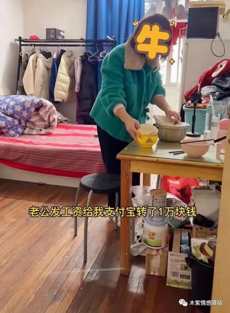一名年轻女子穿绿色毛呢外套正在收拾家务,女子一边收拾一边絮絮叨叨地讲述:当天老公发了工资,给她某消费软件转了一万元,让她一个月内花完,没想到,她当天就花了一干二净。