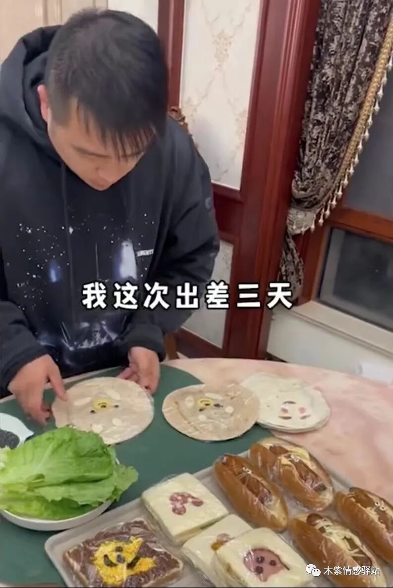 原来,男子因为工作需要要出差三天,家里有妻子和两个孩子,他担心妻子照顾两个娃,不能好好做饭,于是连夜加班给娘仨准备各种美食。