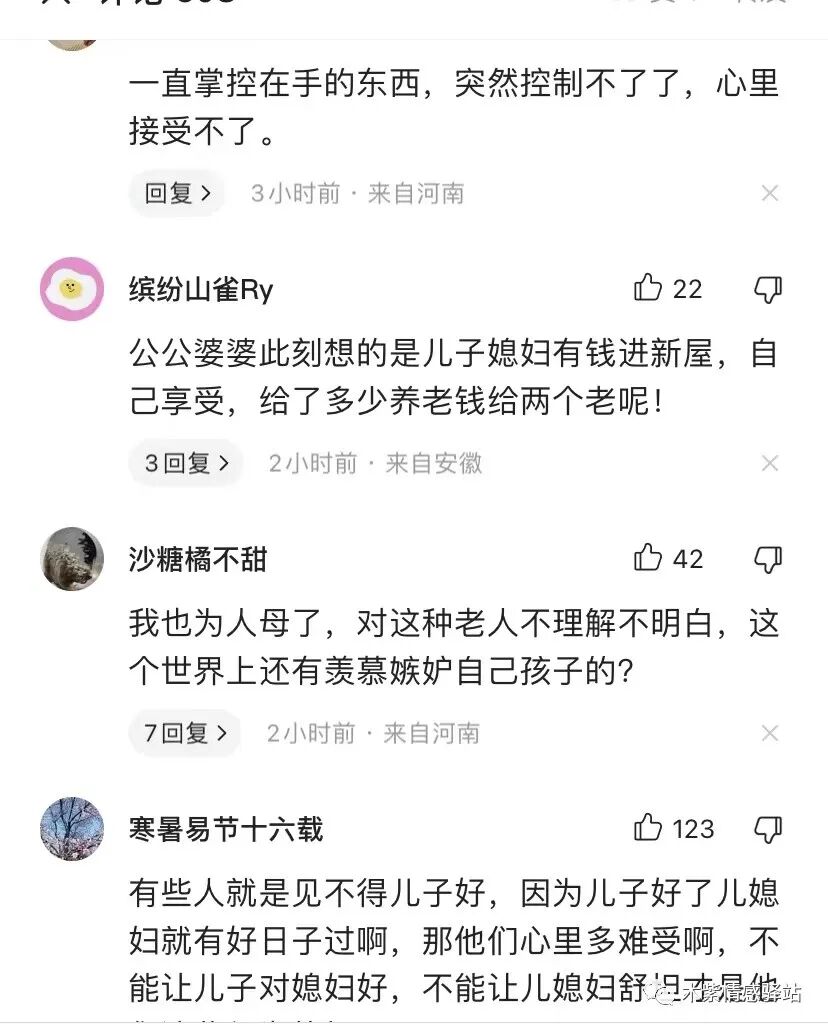 还有网友猜测是不是因为儿媳没有同意他们一块跟着搬进新房?所以两位老人才不开心。