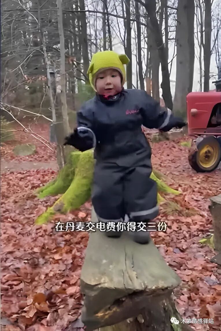 看得出来,当地现在也是很冷,人们都穿着厚厚的棉服,一个可爱的三岁左右的宝宝,在树林里欢快地跑来跑去,一副其乐融融的家庭画面。
