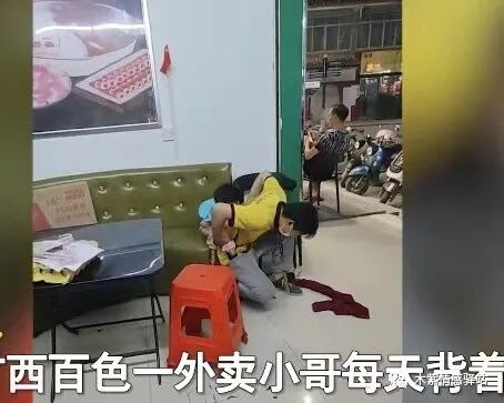 近日,广西百色,一位樊女士分享了一段感人的视频,画面中, 一位穿着黄色外卖服装的年轻男子,半跪着身子,他弯下腰,试图从沙发上把女儿背到身上。