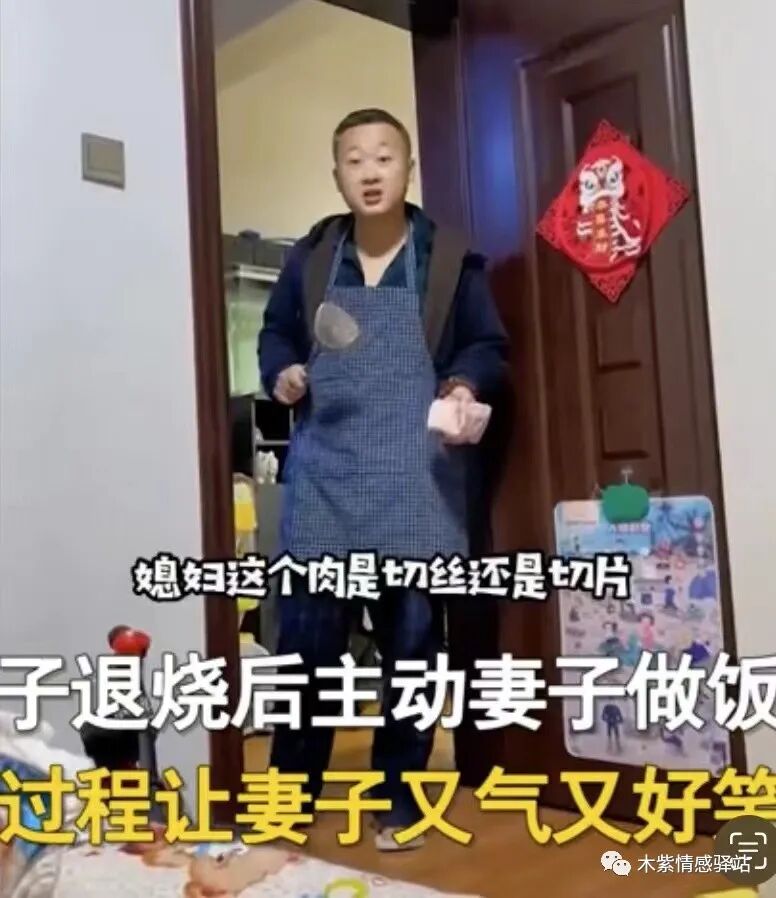“媳妇,照顾肉是切丝还是切片呢?”男子一手拿着锅铲,一手拿着一块肉,站在卧室门口问妻子。