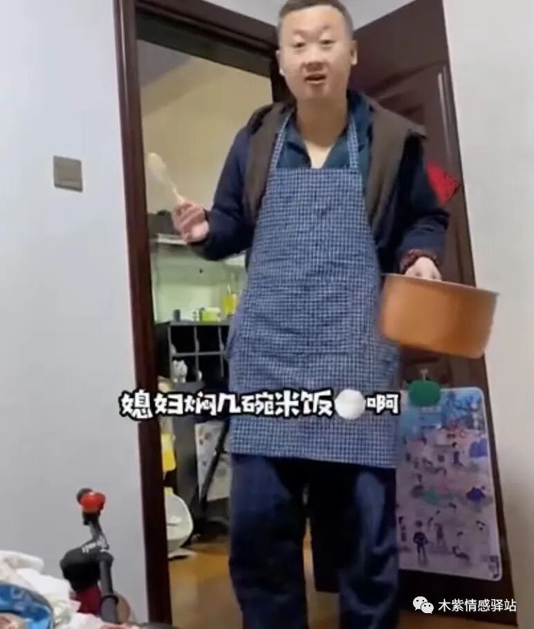 妻子刚躺下,男子有一手拿着塑料米勺,一手拎着电饭煲,问妻子:“媳妇,咱们一家人焖几碗米饭?”