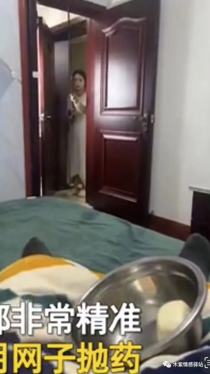 只见男子躺在床上,面前放了一个大铁盆,年轻的妻子就站在卧室门口,先是拿着喷壶,冲着室内消毒,接着,伸长鱼竿给男子送口粮,妻子轻轻一挥钓鱼竿,那做好的饭菜就稳稳当当地放进了男子面前的铁盆里。