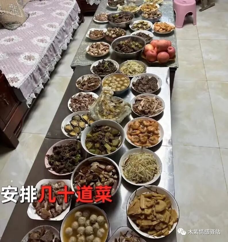 这几十道菜,都是爸妈的心血之作,充分表达了他们对未来女婿的热情和重视,女子说自己的舅舅听说后,还特地从市区开车赶来,让她和男友都非常感动,受宠若惊。
