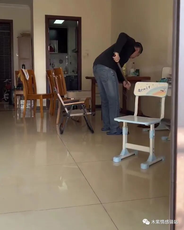 房间内,一名稍大点的女孩正在开心地玩耍,身后是孩子们的爸爸,一个身材高大的年轻男子,穿着黑色上衣,牛仔裤,正在认真地拖地,打扫卫生。