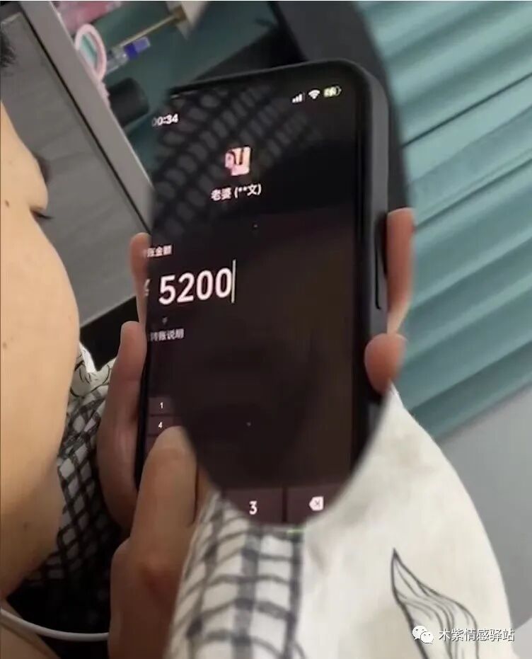 妻子听了后,内心激动不已,开心地等着男子给自己转账,男子随后拿起手机,小心翼翼地开始输入金额。