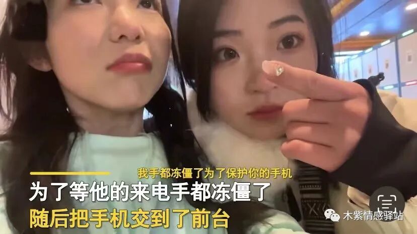 其中一名女生有点抱怨地说:等你打电话,我们都等了很长时间了,旁边的女生更可爱,她伸出自己的纤纤玉手,表示为了保护男子的手机,我的手都冻僵了!