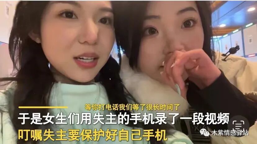 画面中,两位年轻漂亮的女生,面对着镜头,认真地录制着视频:希望你保护好自己的手机,你的手机掉了,你都不知道。记得给你的手机打电话哦,我们两个捡到了。我们要交给大厅了哈,再见,我们是好心人!